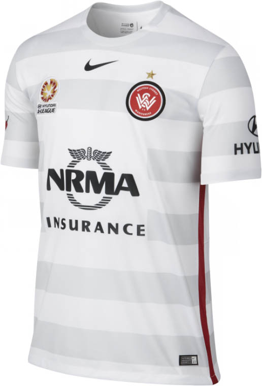 Das neue Western Sydney Wanderers 15-16 Auswärts-Trikot, das auf demselben Template wie das Heim-Trikot basiert, führt ein sauberes Design ein. Das neue Western Sydney 2015-16 Trikot ist weiß mit hellgrauen Querstreifen, während ein roter Streifen auf der Seite des Trikots verläuft.
