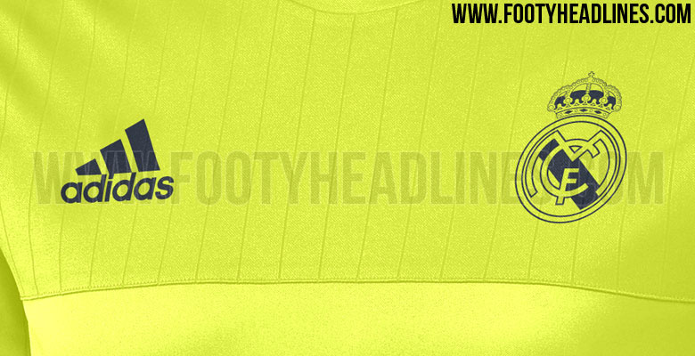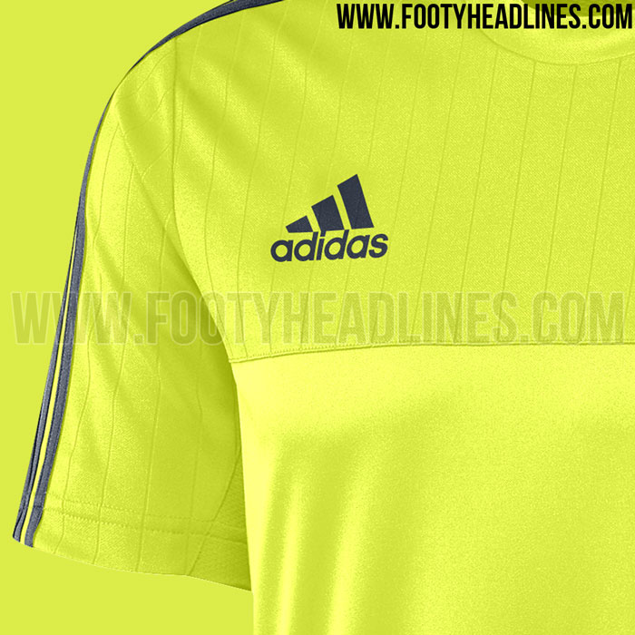 Das neue gelbe Adidas Real Madrid 2016 Trainings-Trikot, das auf dem gleichen Design wie die vorherigen Real Madrid Trainings-Trikots basiert, kommt mit klassischen drei Streifen auf den Ärmeln und hat ein subtiles Linienmuster auf der oberen Vorderseite und den Ärmeln.