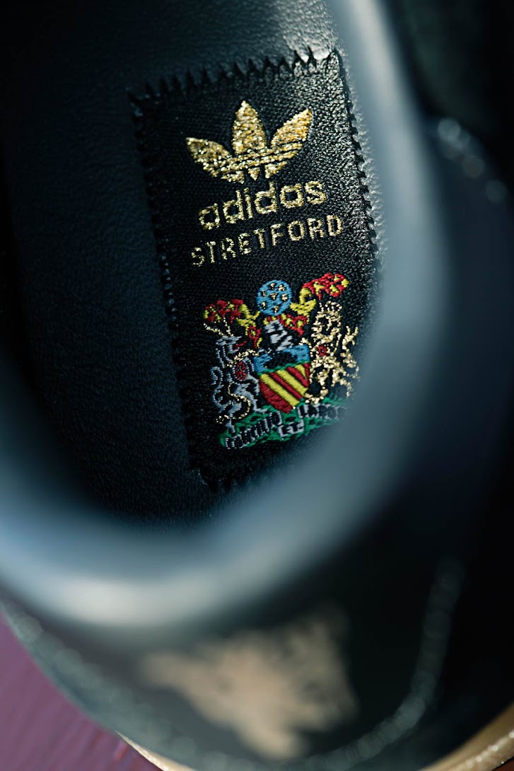 Der Heel Counter aus Leder zeigt Manchester Uniteds kultigen Teufel, während die Innensohle des Adidas Stretford das Stadtwappen von Manchester aufweist, um Manchester Uniteds Ursprünge in der Gemeinde hervorzuheben.