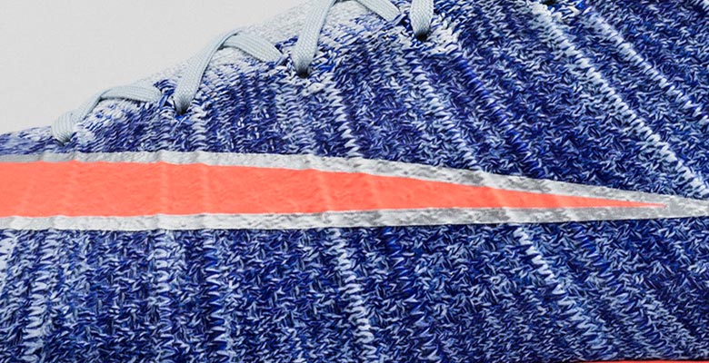 Die blauen Nike Mercurial Superfly 2016 Frauenschuhe haben einen hellblauen Dynamic Fit Abschluss, während der Flyknit-Teil des Schuhs hauptsächlich in einem gesättigteren Blauton gehalten ist. Verschiedenfarbige Fasern schaffen einen schönen "Multicolor" Effekt, auch wenn dieser weniger hervorgehoben als bei den markanten Nike MercurialX Fußballschuhen des letztjährigen Sommers ist.