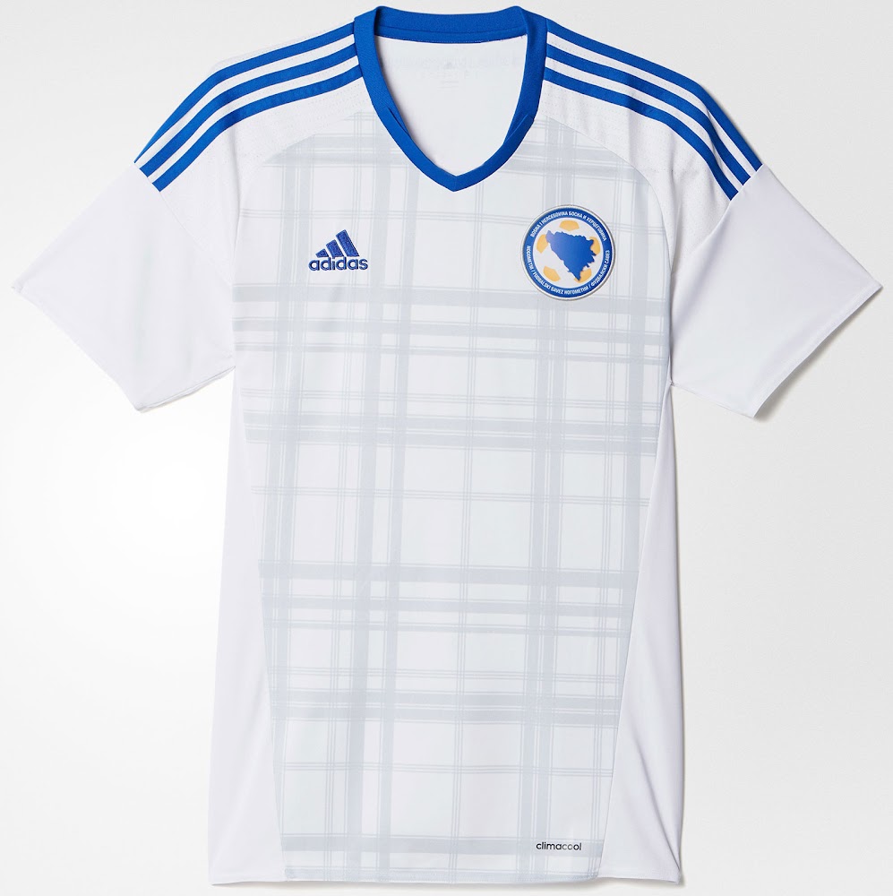 Das Adidas Bosnien EM 2016 Trikot ist weiß mit blauen, traditionell positionierten 3 Streifen und einem blauen V-Kragen, der exakt wie der des Bosnien Heimtrikots geformt ist. Ebenso wie das neue Bosnien 2016 Heim-Trikot ist das Bosnien 2016 Auswärtstrikot, das Teile älterer Adidas Trikots aufweist, eine Mischung verschiedener alter Adidas Kreationen.