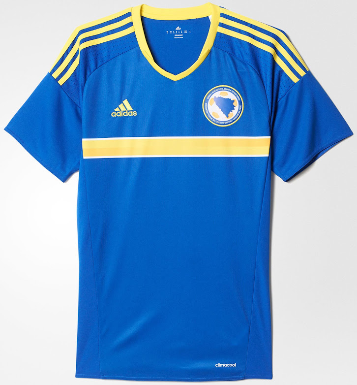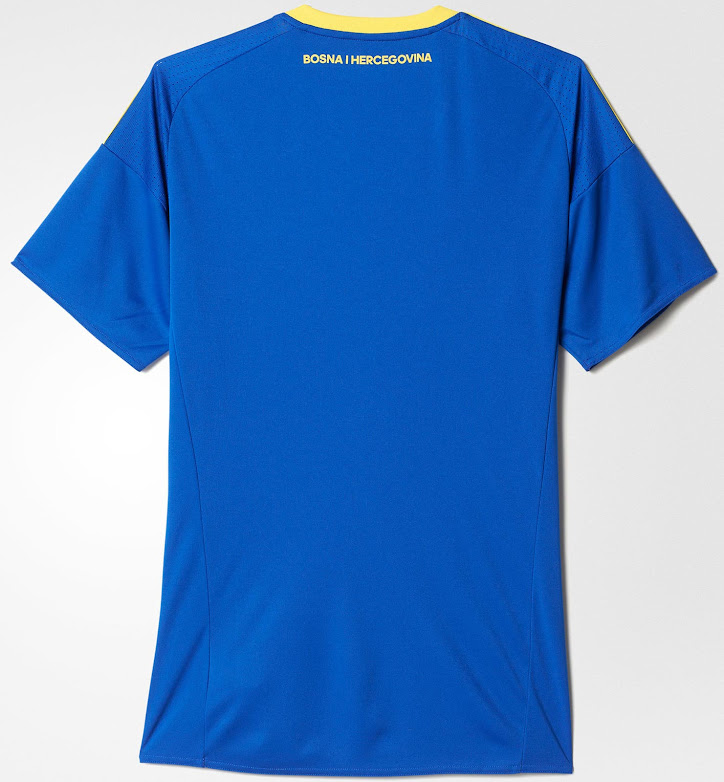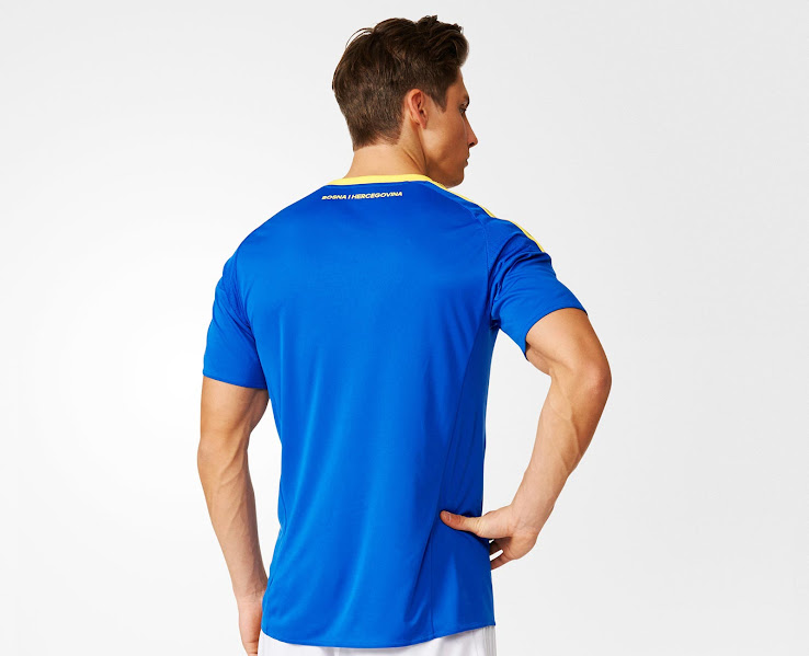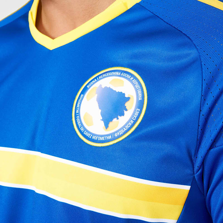 Nachdem die allerersten Adidas Bosnien Trikots für die WM 2014 auf Templates basierten, hat das neue Bosnien 2016 Trikot ein maßgeschneidertes Design. Das Bosnien 2016 Trikot ist in den Landesfarben Blau und Gelb mit weißen Details gehalten. Ein gelber V-Kragen wird für das Bosnien 2016 Trikot verwendet, während ein gelber Brustring auf der Vorderseite vorhanden ist.