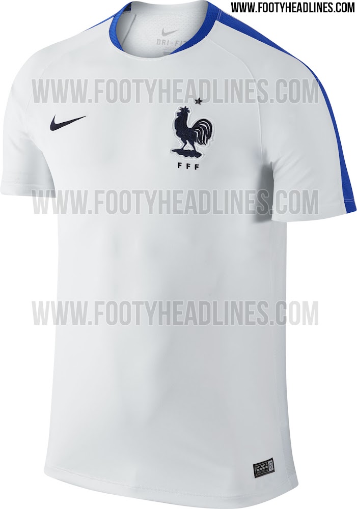 Interessanterweise weist das weiße Frankreich Trainings-Trikot dieselbe Grundfarbe und Akzentfarben wie das Frankreich 2016 Auswärts-Trikot auf.