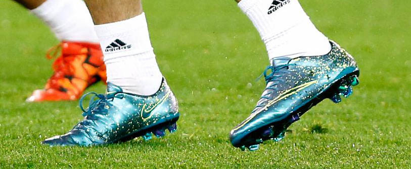 Isco trägt eine unveränderte Version der Nike Mercurial Vapor X Lightning Storm Pack Fußballschuhe, die vor exakt einem Monat veröffentlicht wurden. Die Nike Mercurial Vapor Lightning Storm 2015-2016 Schuhe, die ein schimmerndes blaues Obermaterial mit auffälligen gelben Farbspritzern kombinieren, wurden entworfen, um herauszuragen.
