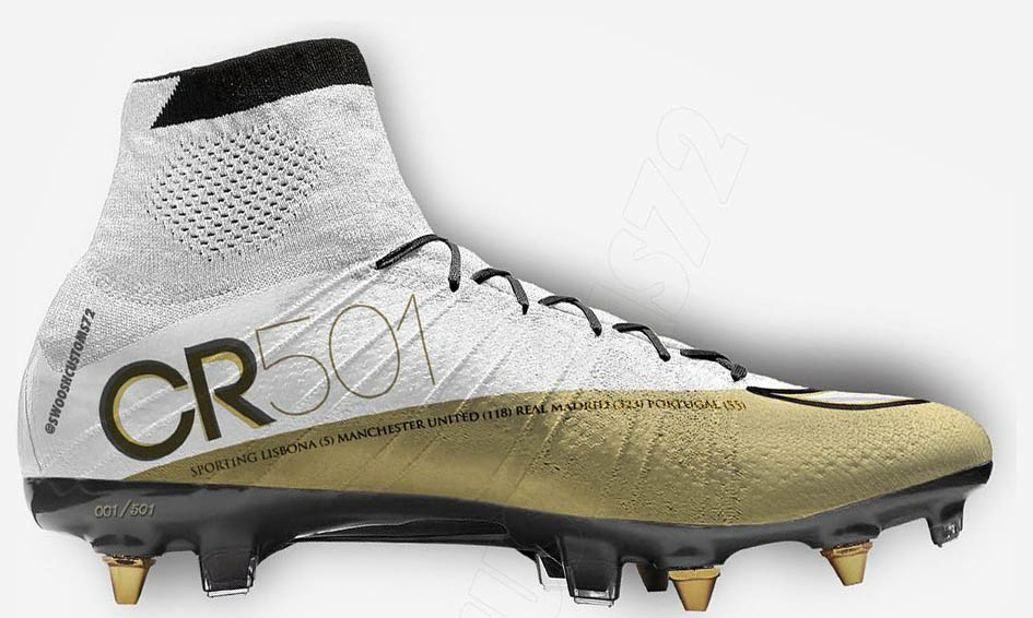 Swoosh Customs Nike Mercurial Superfly "CR 501" Konzeptschuhe weisen die Stückzahl auf, graviert auf die schwarze Außensohle - ein gewöhnliches Feature limitierter Nike Releases. Die fiktionalen Schuhe sind offensichtlich auf 501 Paare limitiert.