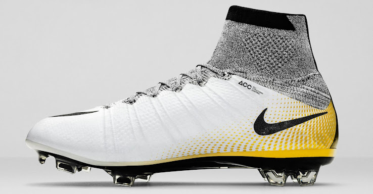 Das Flyknit Obermaterial der Nike Mercurial Superfly Cristiano Ronaldo 324K Gold Schuhe kombiniert die Hauptfarbe Weiß mit dem typischen Farbverlauf der Nike Mercurial Vapor 3 Fußballschuhe im Fersenbereich. Der Swoosh des Nike Mercurial Cristiano Ronaldo 324K Gold Schuhs weist die kontrastierende Farbe Schwarz mit subtilen weißen Details auf, während der Dynamic Fit Abschluss grau ist.
