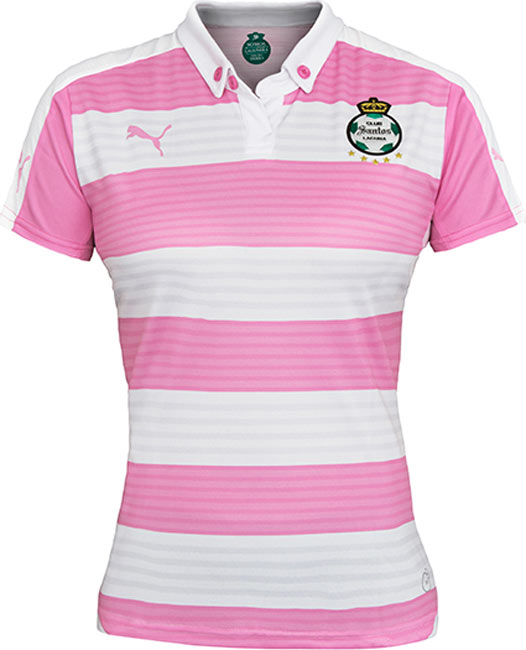 Puma hat ein schwarz / pinkes Queretaro Trikot entworfen, das dem gleichen Farbschema folgt, während das Santos Laguna Project Pink 2015 Trikot weiße und pinke Querstreifen aufweist.
