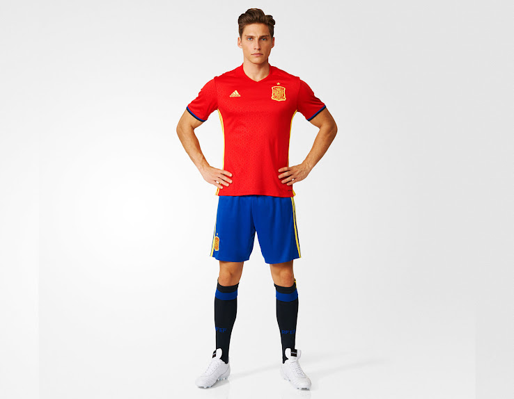 Das neue Spanien EM 2016 Trikot wird mit königsblauen Hosen und dunklen dunkelblauen Stutzen kombiniert. Es ähnelt der traditionellen Kombination, die bis zur WM 1994 verwendet wurde, und steht im Gegensatz zum ungewöhnlichen, vollkommen roten Spanien WM 2014 Trikot.