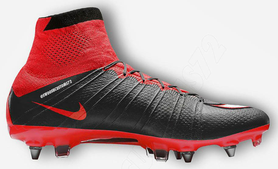 Der Nike Mercurial Superfly "AM Home" Schuh hat ein geteiltes Design in den berühmten Farben von ManUs Heimtrikot. Swoosh Customs hat einen hauptsächlich schwarzen Schuh mit einem weißen Swoosh entworfen, während die NikeSkin Schicht auf der Innenseite rot ist - ein zweifarbiger Look.
