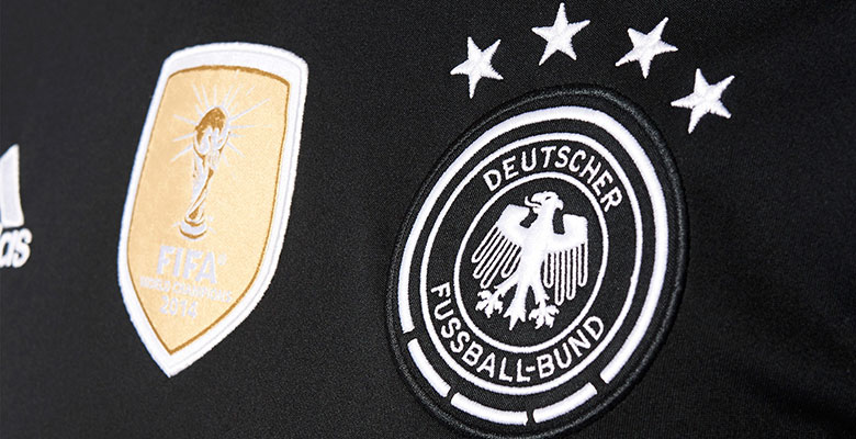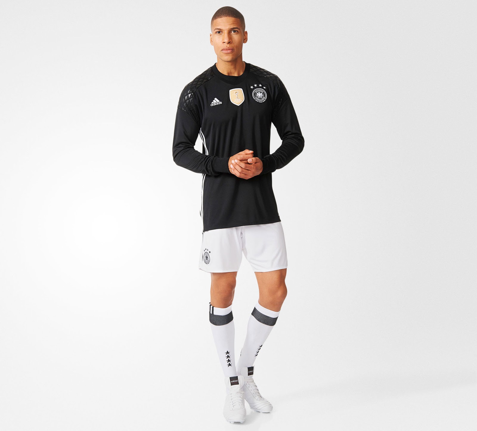 Das Deutschland EM 2016 Torwart-Trikot, das der erfolgreichen WM 2014 nachfolgt, trägt sowohl das WM-Siegerwappen als auch den kultigen vierten Stern oberhalb des Emblems der Nationalmannschaft. Es wird mit weißen Hosen und Stutzen kombiniert, der direkte Gegensatz zu dem Deutschland EM 2016 Heimtrikot.