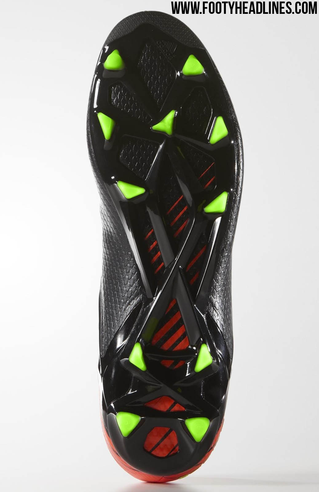 Die schwarz / grün / roten Adidas Messi 2015-2016 Fußballschuhe, die entworfen wurden, um auf dem Platz herauszuragen, weisen das unverwechselbare Messi Zeichen auf dem Obermaterial auf, während das Obermaterial von einem schwarzen Vorderfußbereich zu einer auffälligen roten Ferse übergeht.