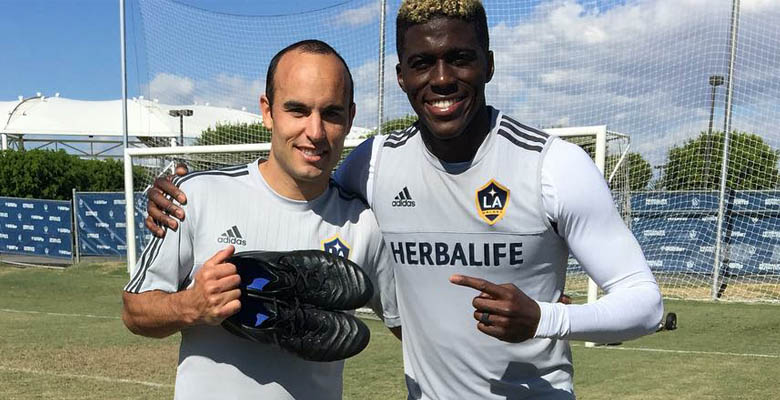 Enthülle das Unveröffentlichte. Der ehemalige LA Galaxy Superstar Landon Donovan hat auf Twitter ein Bild von sich mit Gyasi Zardes veröffentlicht, auf dem die beiden Profis zwei Schuhe gleichzeitig enthüllen - eine Blackout Version der Nike Tiempo Legend 6 Fußballschuhe, und die auffälligen Adidas Messi 2015-2016 Schuhe.