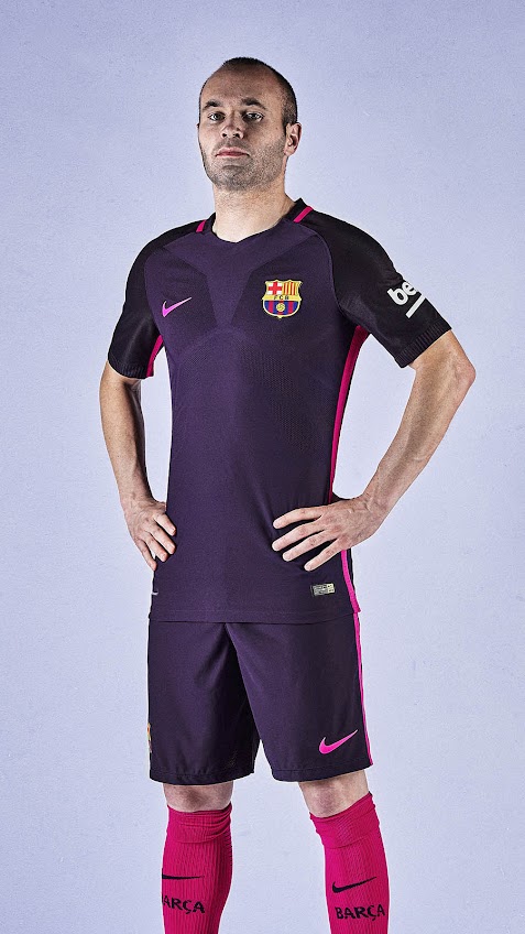 Das Barcelona 2016-17 Trikot, das auf Nikes Vapor Trikot-Template basiert, das bereits für das Barcelona 16-17 Heimtrikot als auch die Copa-America- und EM-Trikots der Marke verwendet wird, ist hauptsächlich lila mit schwarzen Ärmeln und pinken Markenzeichen.