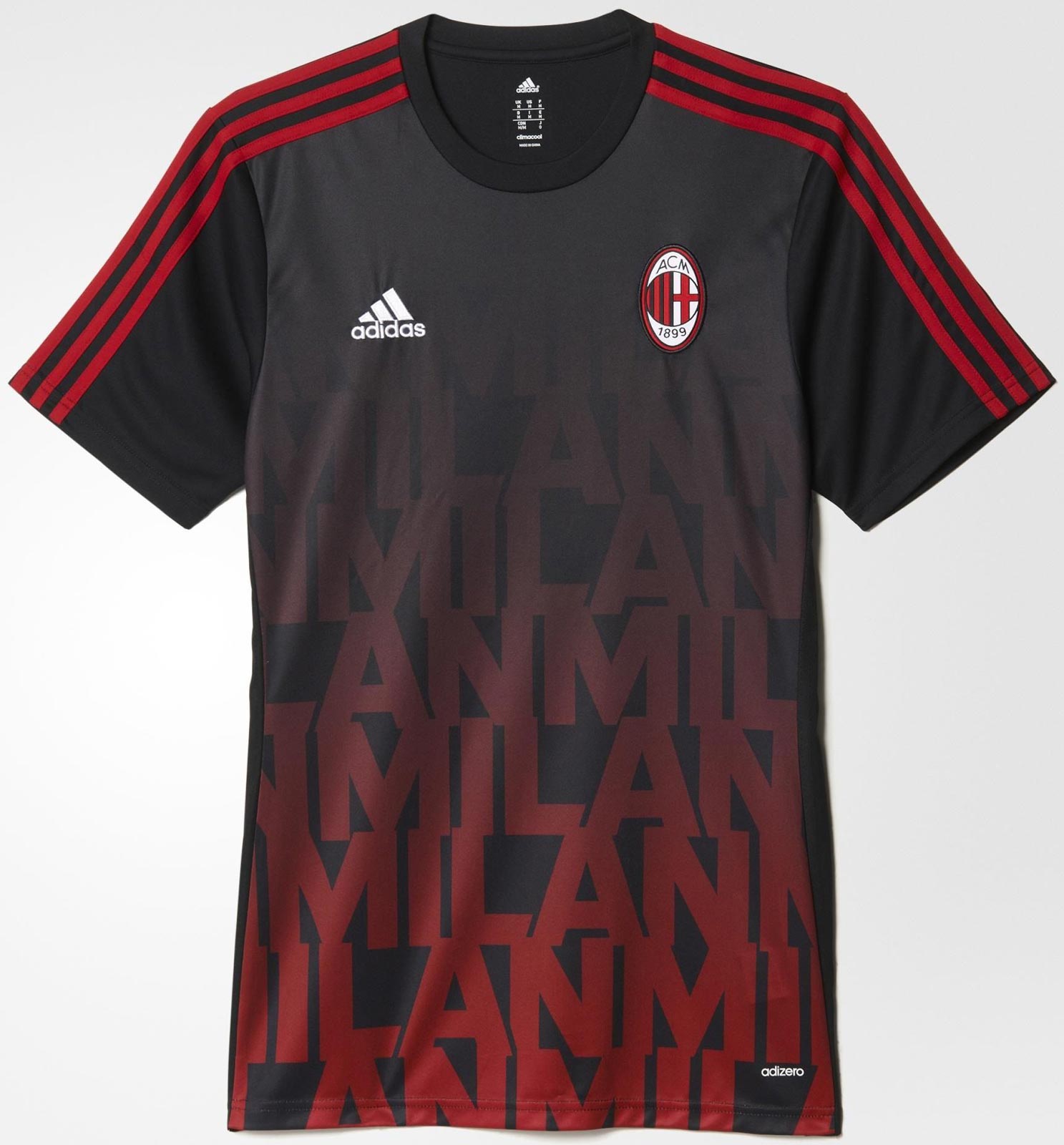 Das neue Milan 2016 Pre-Match Trikot, das eine schwarze Grundfarbe mit einem auffälligen roten Grafikdruck kombiniert, der sich über die gesamte Vorderseite zieht, hält sich an denselben Designansatz wie alle Adidas 2016 Aufwärm-Trikots.
