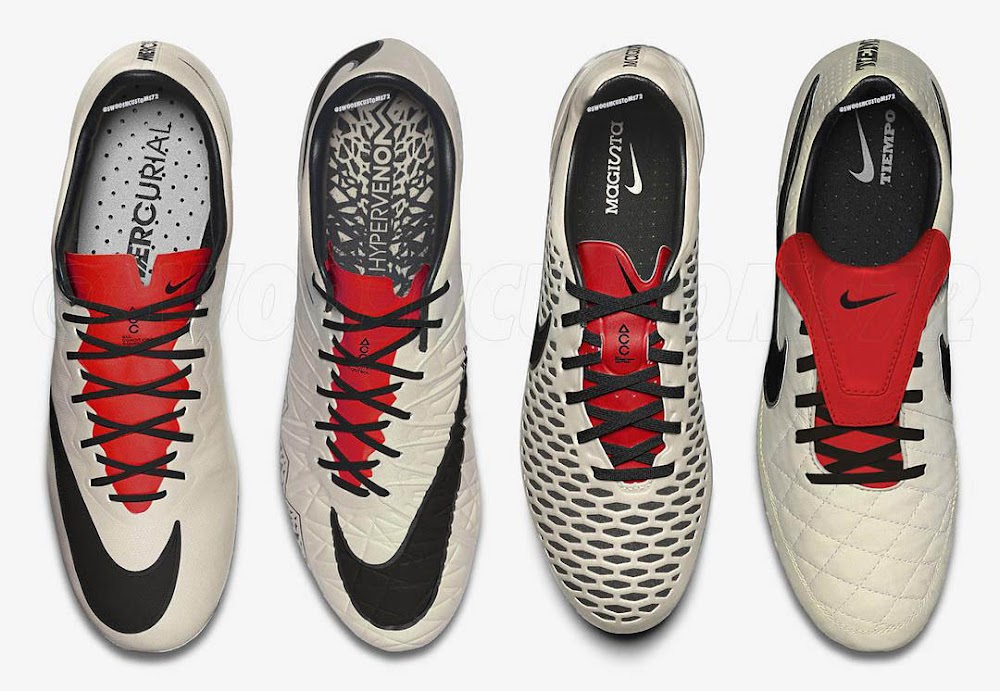Die Mania Editionen des Nike Hypervenom, Magista, Mercurial und Tiempo, die das Design der Adidas Predator Mania 2002 Fußballschuhe widerspiegeln, kombineren das weiße Obermaterial mit einer roten Zunge und schwarzen Applikationen und Schnürsenkeln.