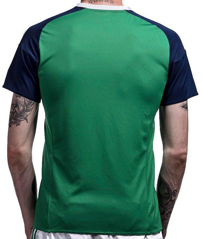 Das Adidas Nordirland 2016 Trikot, das auf dem gleichen Template wie das neue Bosnien EM 2016 Trikot basiert, ist hauptsächlich grün mit dunkelblauen Ärmeln und einem weißen V-Kragen. Ein Brustring in Blau und Weiß vervollständigt das einzigartige Design des neuen Nordirland Trikots.