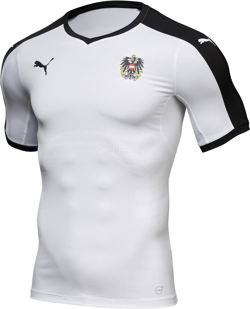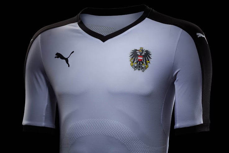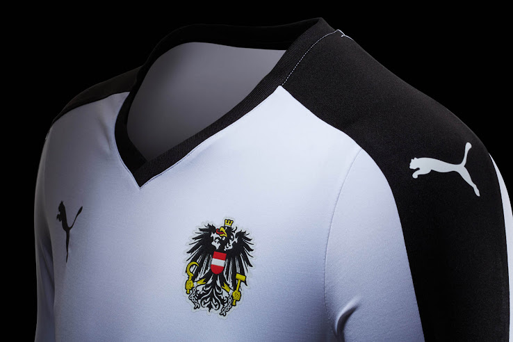 Das neue Österreich EM 2016 Trikot kombiniert eine weiße Grundlage mit gewagten schwarzen Akzenten in Form eines Streifens auf jedem Ärmel, den Ärmelenden und des V-Kragens.