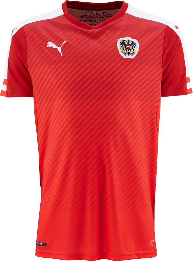 Das neue Österreich Trikot, das auf dem gleichen Template wie das ebenso moderne Puma Italien EM 2016 Trikot basiert, ist größtenteils rot mit einer ausgeklügelten Grafik auf der Vorderseite. Diagonale Linien unterschiedlicher Breite bilden einen Effekt, der aus der Nähe und Weite interessant anzusehen ist.