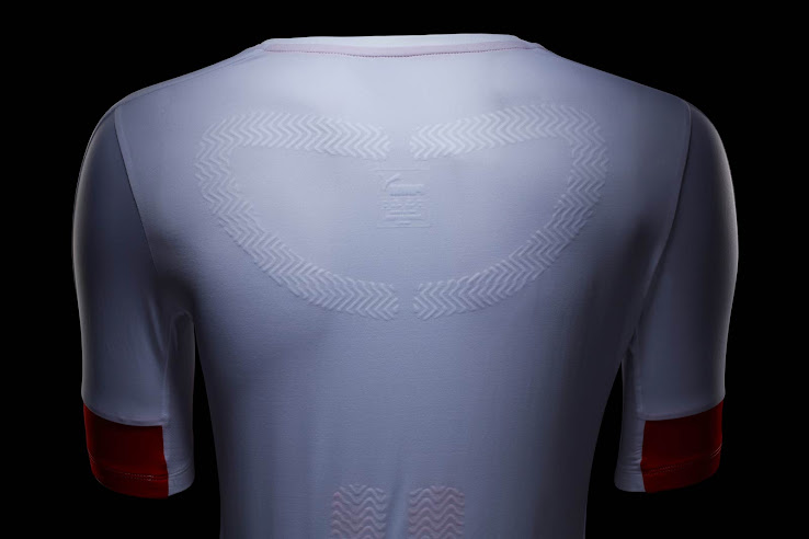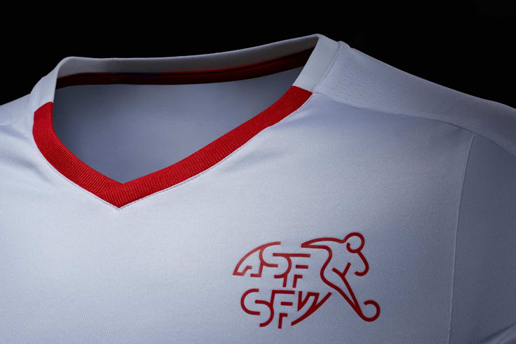 Weitere rote Details sind in Form der vorderen Hälfte des modernen V-Kragens und eines Streifens am unteren Ende des Ärmels vorhanden, während das Innere des Kragens die gleiche Grafik wie das Schweiz Heimtrikot enthält.