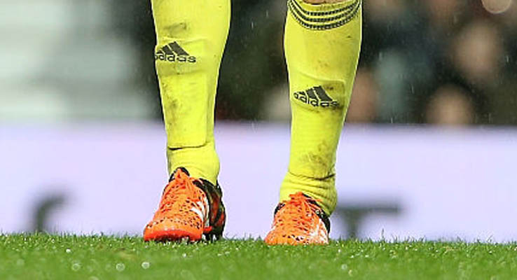 Manchester United Torwart-Legende Edwin van der Sar lief in der synthetischen Version der orangen Adidas Ace 2015 Schuhe auf.