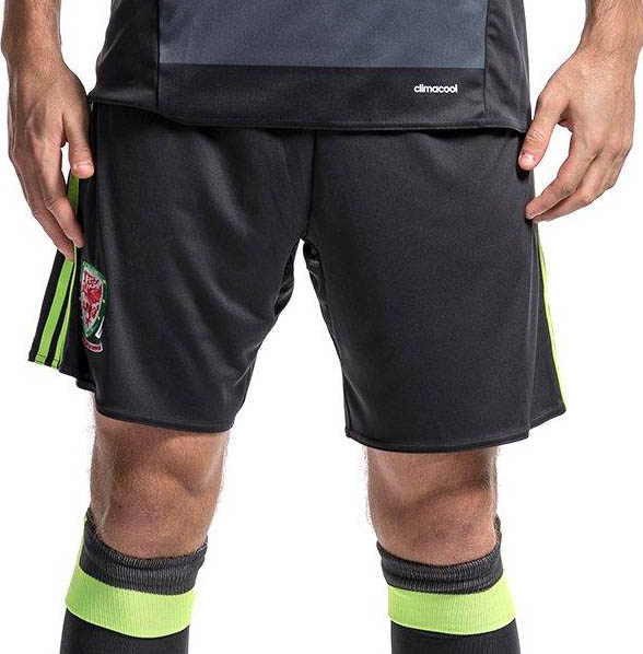 Dunkelgraue Hosen und Stutzen komplettieren das neue Adidas Wales EM 2016 Trikot.