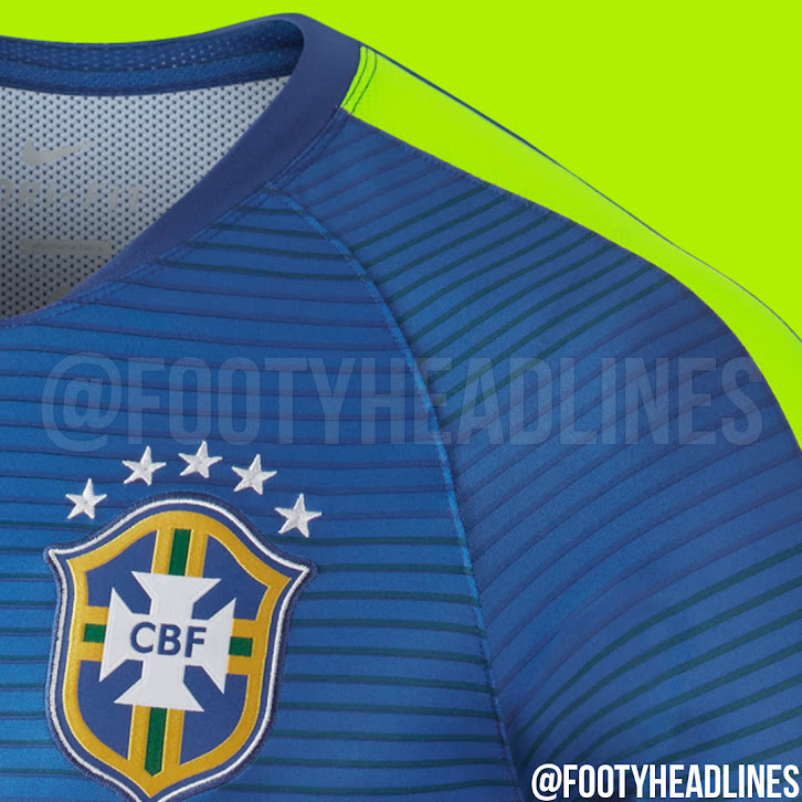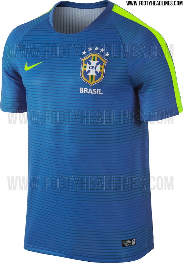 Nike kombiniert das hauptsächlich blaue Trikot mit einem auffälligen Gelb ("Volt"), das für den Swoosh und die Linien auf den Ärmeln verwendet wird. Auf der Rückseite unterhalb des Kragens steht der Schriftzug Brasilien. Interessanterweise ist der Schriftzug deutlich kleiner als der, der auf Brasiliens 2015 Aufwärm-Trikot zu sehen ist.