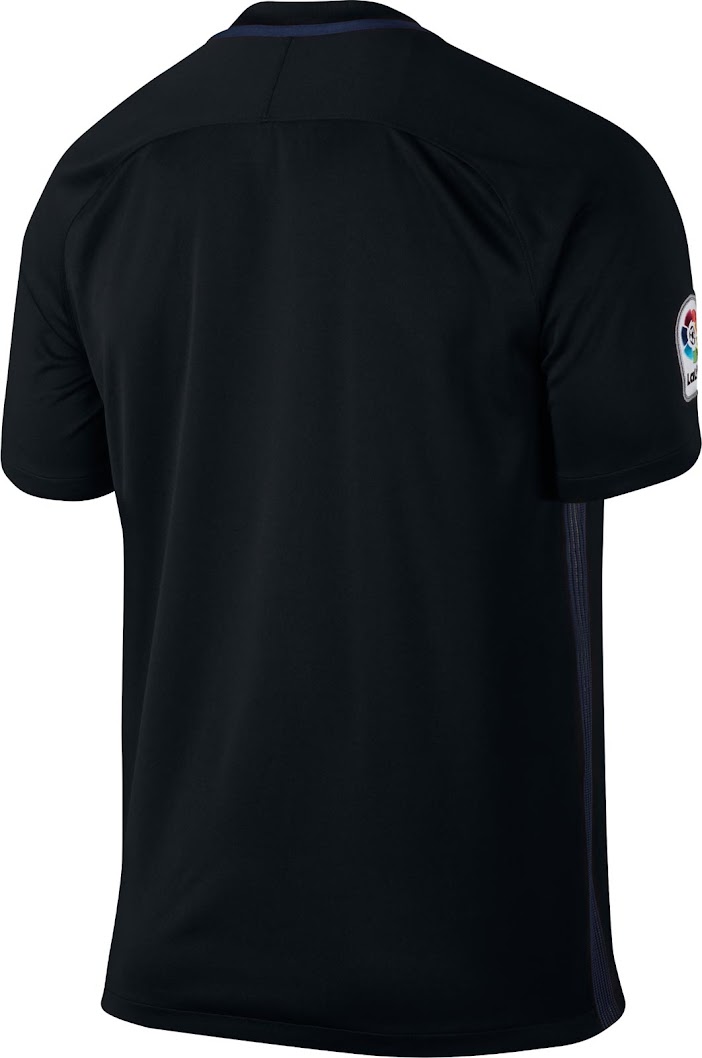 Das Atletico Madrid 16-17 Trikot, das von Nike hergestellt wird, ist schwarz mit dunkelblauen und goldenen Details. Alle Sponsorenlogos sowie das Atlético-Madrid-Wappen sind einfarbig und golden.