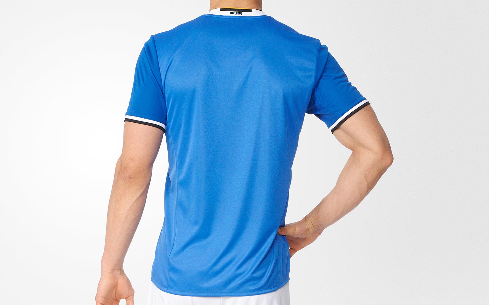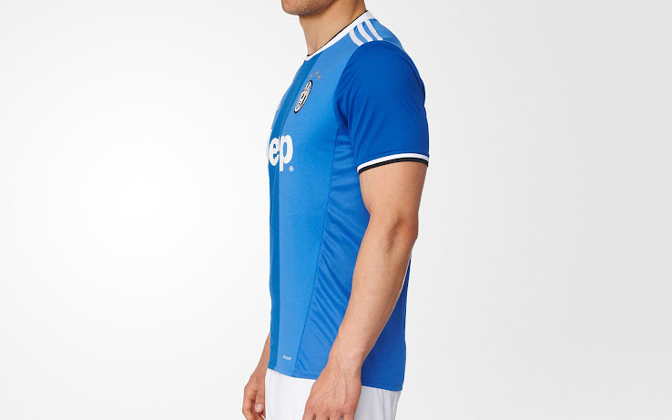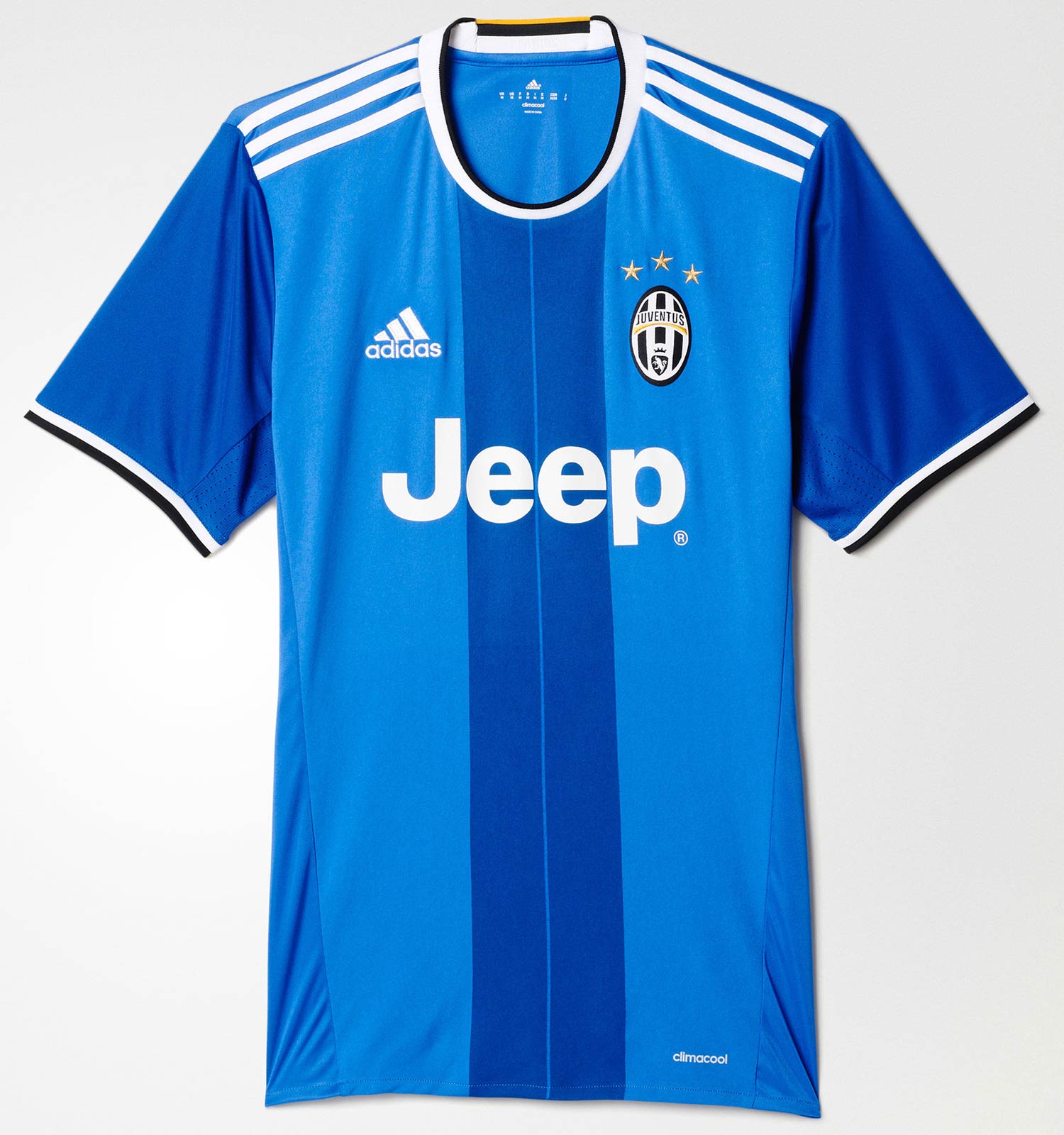 Die Ärmel des neuen Juventus 2016-2017 Trikots sind einfarbig blau mit schwarz-weißen Ärmelenden, während der Kragen, der auf Adidas normalem Rundkragen-Stil für die neue Saison 2016-17 beruht, weiß mit schwarzen und gelben Details ist. Das Jeep-Sponsorenlogo ist einfarbig in Weiß auf die Vorderseite des Adidas Juventus 2016-17 Trikots gedruckt und man verzichtet auf den umgebenden Kasten, der vom Juventus-Heimtrikot bekannt ist.