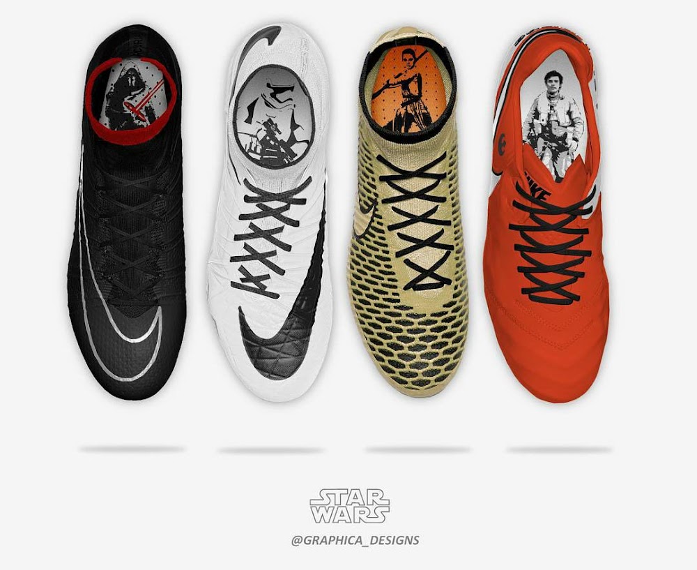 Graphica Designs Star Wars Kollektion, die von Schlüsselcharakteren des neuesten Star-Wars-Films inspiriert wurde, Poe Dameron, Rey, den Sturmtruppen und Kylo Ren, besteht aus vier Modellen. Diese Modelle heißen "Air Solider" (Tiempo Legend VI), "Desert Walker" (Magista Obra), "Raider" (Hypervenom Phantom II) und "Coldblood Killer" (Mercurial Superfly IV).