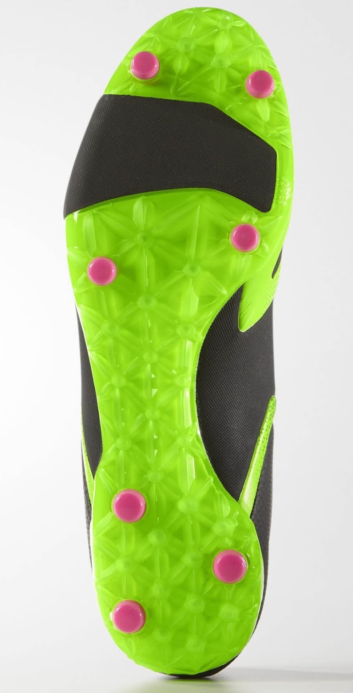 Die Außensohle der Adidas Ace 16+ Tekkers Fußballschuhe, die auf jeglichen künstlichen Belägen verwendet werden kann, zeichnet sich durch eine einzigartige geometrische Konstruktion mit sieben außergewöhnlichen pinken Stollen und eine besondere Platte für mehr Haltbarkeit im vorderen Teil, wo es am notwendigsten ist, aus.