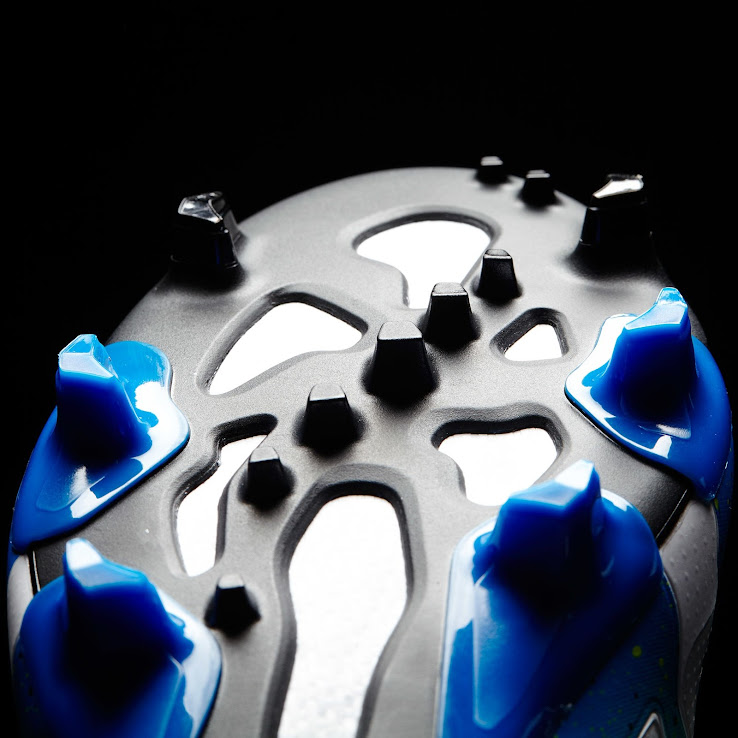 Adidas kombiniert das Obermaterial des Schuhs mit einer hauptsächlich schwarzen Außensohle, die sechs blaue Stollen und eine zweite Ebene Stollen für Bodenhaftung auf Kunstrasen aufweist, inspiriert von den Spikes von Laufschuhen.