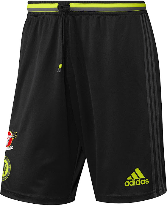 Chelseas zweites 2016-2017 Trainingstrikot, das im selben Design wie das erste Trainingstrikot gehalten ist, kombiniert Schwarz und Dunkelgrau mit fluoreszierend gelben Logos und Applikationen.