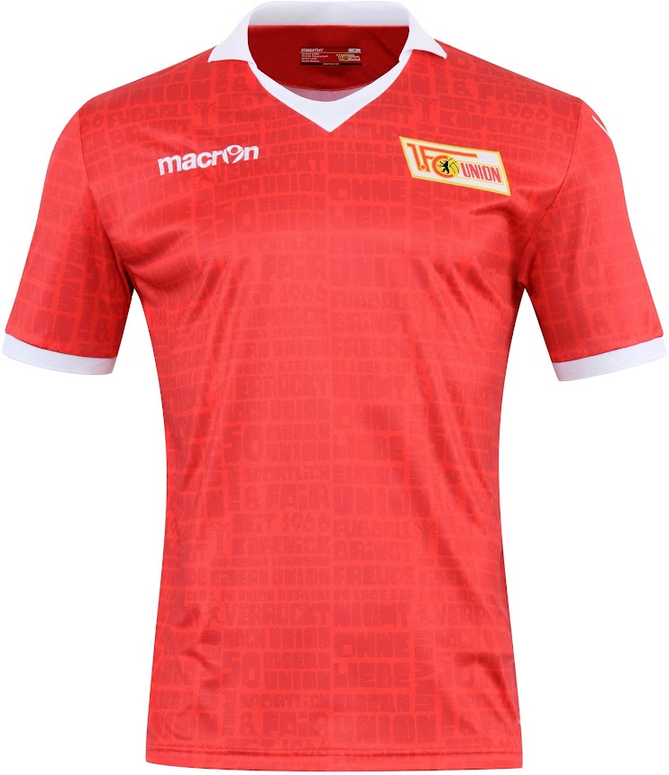 Das neue Union Berlin 2016 Jubiläumstrikot, das die traditionellen Farben Rot und Weiß kombiniert, weist einen tonalen Druck, der sich über das gesamte Trikot zieht, und die berühmtesten Slogans wie "Verrückt nach Union", "Sportlich & Fair" und "Nicht ohne Liebe" auf.
