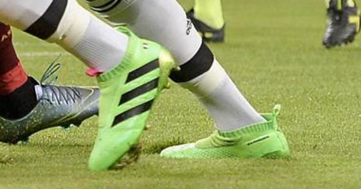 Paul Pogba lief in der normalen Edition der revolutionären Adidas Ace PureControl Fußballschuhe ohne Schnürsenkel auf. Die außergewöhnlichsten Elemente von Paul Pogbas Schuhen sind, trotz des ins Auge springenden Designs, die französische Flagge im Fersenbereich und ein besonderer Schriftzug auf der Innenseite, der noch nicht zu erkennen gewesen ist.