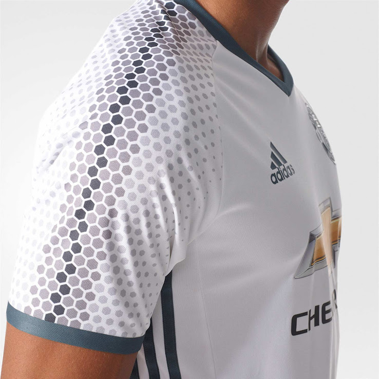 Das neue Manchester United 16-17 Trikot führt in Weiß und Grau eine völlig neue Farbkombination für den Klub ein. Das neue Manchester-United-Trikot, das am 29. Juli 2016 veröffentlicht wurde, weist einen herausragenden Grafikdruck auf beiden Ärmeln auf, der von Arbeiterbiene inspiriert wurde, die im Manchester-Wappen vorhanden ist.