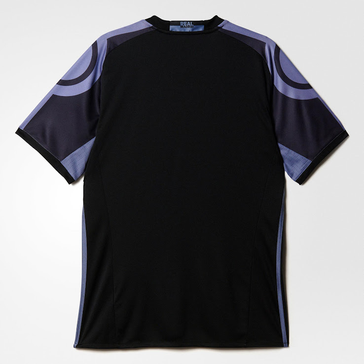 Das neue Real Madrid 2016-17 Trikot ist hauptsächlich schwarz - mit weißen Vereins- und Sponsorenlogos und dunklen, blassen, lila Adidas-Streifen, die auf beiden Seiten verlaufen. Die Ärmelenden und der V-Kragen des Real Madrid 2016-2017 Trikots sind schwarz.