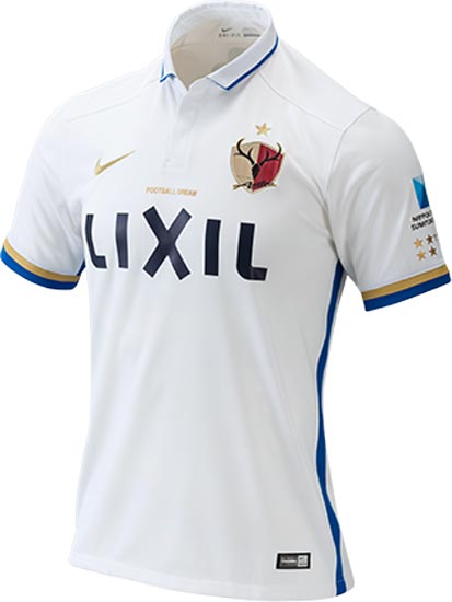 Das Kashima Antlers 2016 Auswärts-Trikot weist dasselbe Template wie das Heimtrikot auf. Das Auswärtstrikot, das hauptsächlich weiß ist, hat Akzente in Gold und Blau.