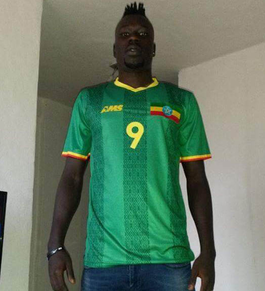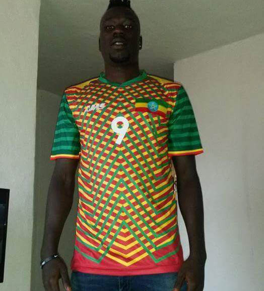 Der äthiopische Verteidiger Gatoch Panom präsentiert zwei der fünf möglichen Äthiopien 2016 Trikots.