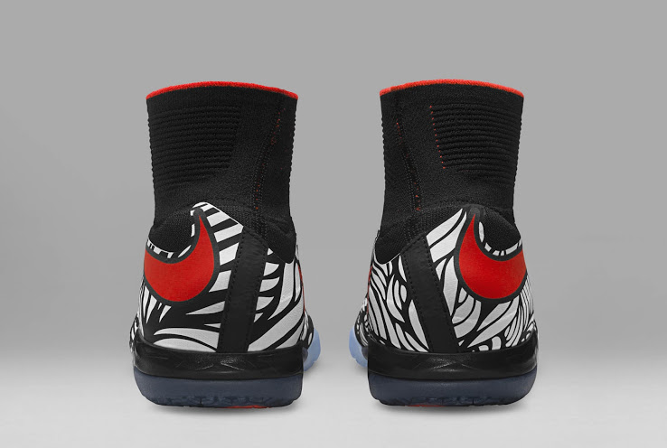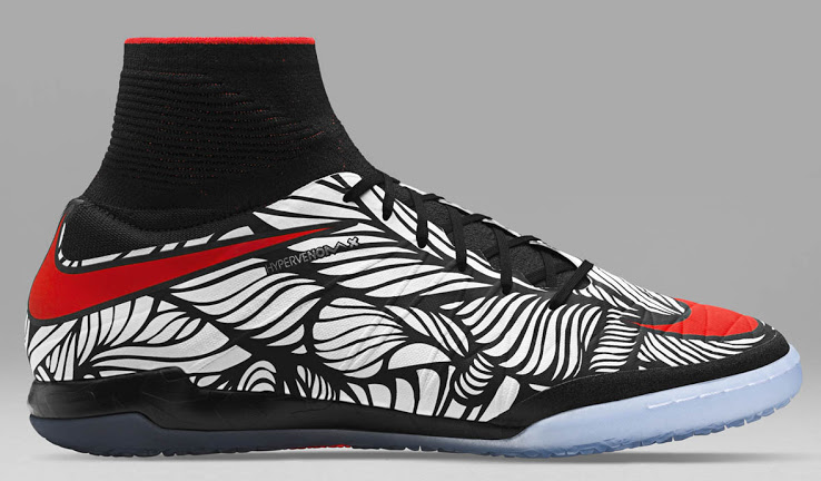 Die Nike Hypervenom X Proximo 2016 Neymar Hallen-, Kunstrasen- und Straßen-Fußballschuhe, die im gleichen Design wie die Nike Hypervenom Phinish und Phantom Outdoor-Editionen gehalten sind, kombinieren die Hauptfarben Schwarz und Weiß mit auffälligen roten Applikationen. Das Obermaterial zeichnet sich durch ein einzigartiges Grafikdesign aus, das von dem brasilianischen Künstler Bruno Big entworfen wurde, der sich von Neymars Motto "Ousadia e Alegria" hat inspirieren lassen.