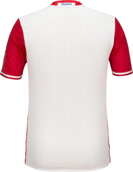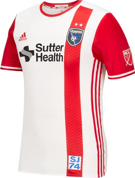 Das neue Adidas San Jose 2016 Trikot ist weiß mit roten Ärmeln und einem einzigen roten Streifen auf der linken Seite. Wie alle anderen MLS 2016 Trikots verlaufen die Adidas-Streifen an den Seiten des neuen San Jose Trikots.