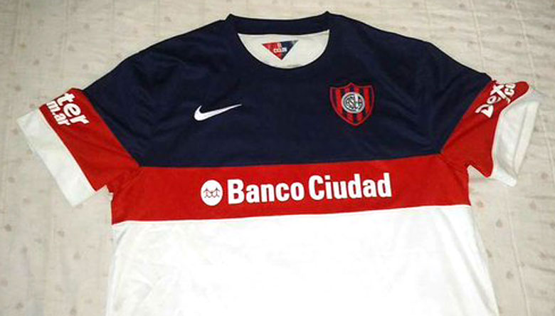 Das San Lorenzo 2016 Trikot, das im Grunde auf dem einzigartigen USA WM 2014 Auswärtstrikot basiert, ist weiß mit gewagten dunkelblauen und roten Farbblöcken auf der oberen Hälfte, den Schultern und den Ärmeln.