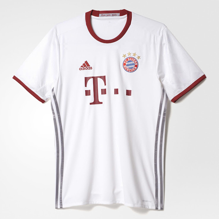 Das neue Bayern München 2016-17 Trikot ist weiß mit Akzenten in Silber und Rot. Das neue Bayern München 16-17 Trikot, das von Langzeitausrüster Adidas hergestellt wird und das Telekom-Sponsorenlogo auf der Vorderseite trägt, wurde am 29. Juli 2016 veröffentlicht - ein paar Monate nach den neuen Bayern Heim- und Auswärtstrikots.
