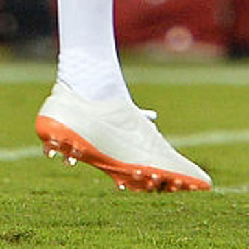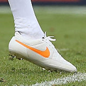Es war nicht einfach zu identifizieren, was genau die Nummer 4 der Denver Broncos letzte Nacht getragen hat, da seine Schuhe ein völlig weißes Obermaterial haben. Jedoch verraten die Nahaufnahmen, dass Britton Colquitt eine Whiteout-Version der Nike Tiempo V AG Fußballschuhe getragen hat, die mit einer orangen Außensohle kombiniert wird, um zu den Farben des Outfits der Denver Broncos zu passen.