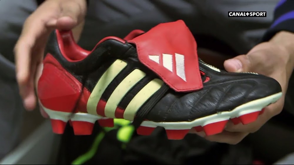 Assou-Ekotto präsentiert seine echten Adidas Predator Mania WM 2002 Fußballschuhe.