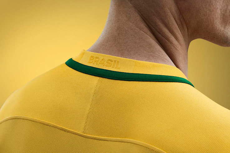 Das Brasilien Copa America Centenario Trikot, das auf Nikes völlig neuem Vapor Trikot-Template beruht, hat eine Linie auf beiden Seiten des Trikots. Grüne Details sind auch in Form einer Linie um die Rückseite des modernen V-Kragens des neuen Brasilien Trikots herum vorhanden.