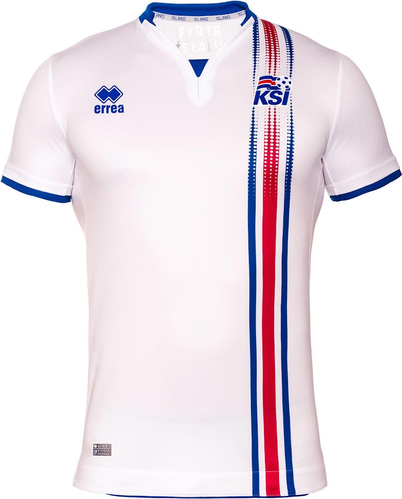 Das neue Island-Auswärtstrikot, das auf dem gleichen Template wie das Island Heimtrikot beruht, ist hauptsächlich weiß. Zwei rote, zwei weiße und ein roter Streifen verlaufen auf der linken Seite des neuen Island Trikots, was von der isländischen Flagge inspiriert wurde. Ein außergewöhnlich geschnittener Kragen in Blau und Weiß, in dem Island steht, komplettiert den zeitgemäßen, dennoch gewagten Look des Island EM 2016 Trikots.