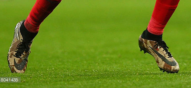 Jamie Vardy trägt eine unveränderte Version der Nike Hypervenom Phantom Fußballschuhe, die sich durch einen Camouflage-Look auszeichnen und ebenfalls das gleiche Obermaterial wie die im Handel erhältliche Version der auf Beweglichkeit ausgelegten Schuhe aufweisen (viele von Nikes besten Spielern haben eine modifizierte Version des Nike Hypervenom II mit dem Obermaterial des Hypervenom I erhalten).