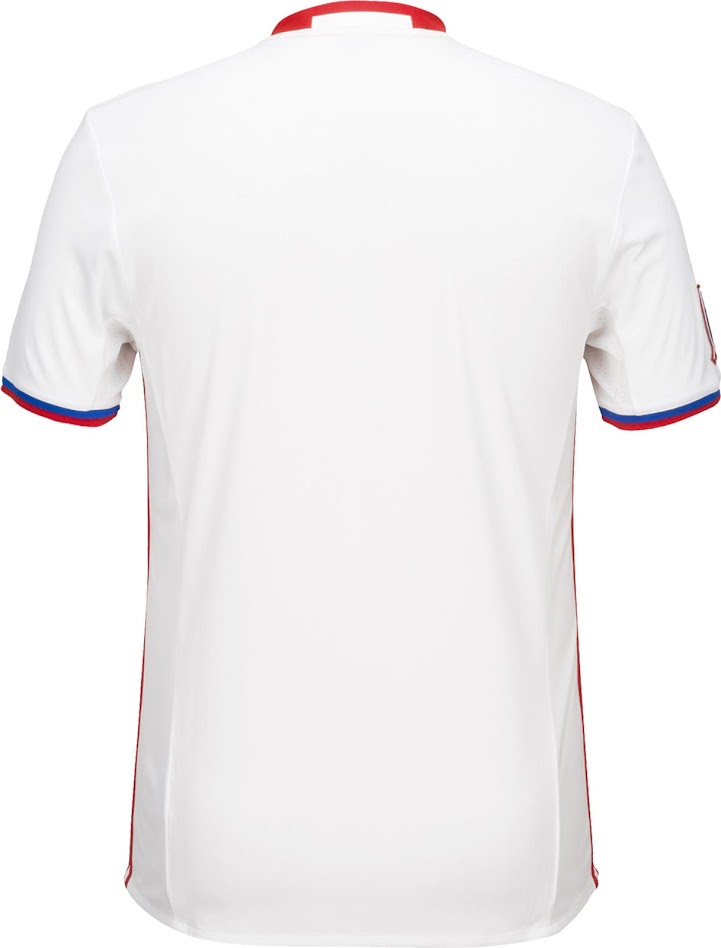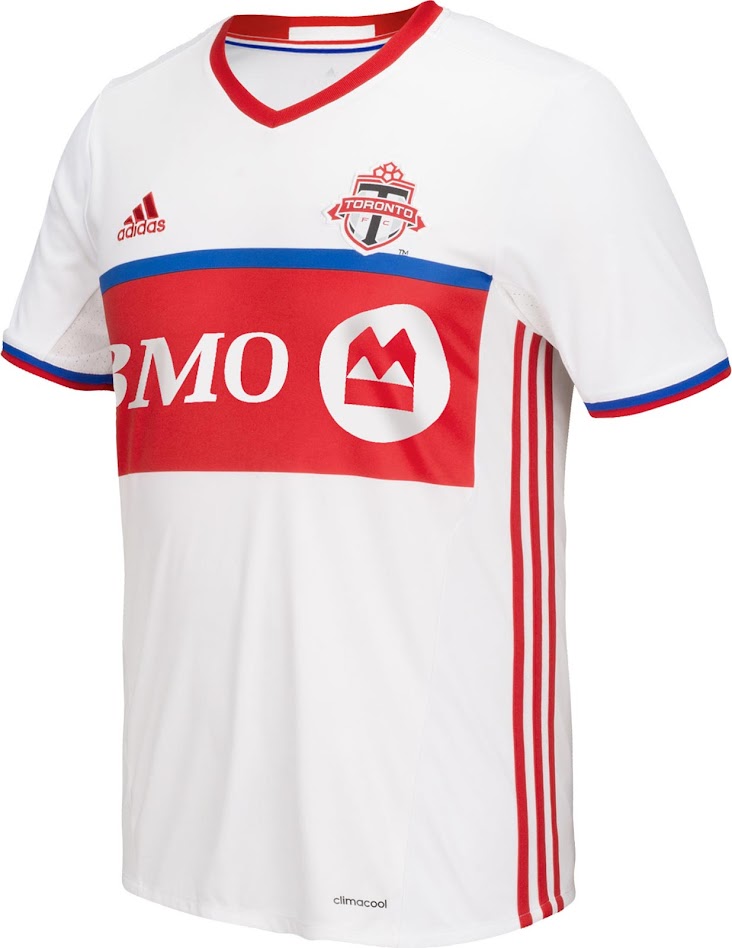 Das neue Toronto Zweittrikot ist hauptsächlich weiß mit einem großen roten und einem dünneren blauen Querstreifen auf der Vorderseite. Die zwei Farben sind auch auf der Innenseite des Kragens des neuen Toronto 2016 Trikots vorhanden - ebenso an den Ärmelenden. Ein roter V-Kragen wird für das neue Toronto-Trikot verwendet.