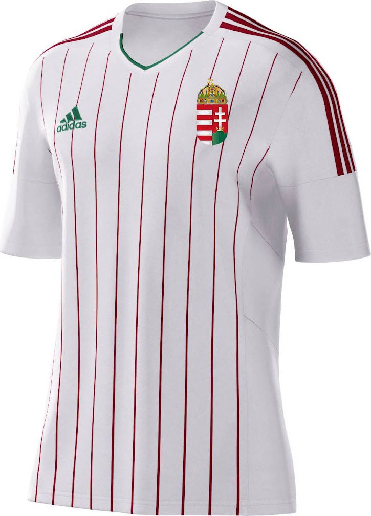 Das neue Ungarn EM 2016 Trikot, das auf dem gleichen Template wie das Ungarn Heimtrikot basiert, ist hauptsächlich weiß, wobei auf jedem Ärmel drei rote Streifen verlaufen. Der Saum und Details auf den Ärmeln sind grün, während der Kragen dem des Heimtrikots gleicht.