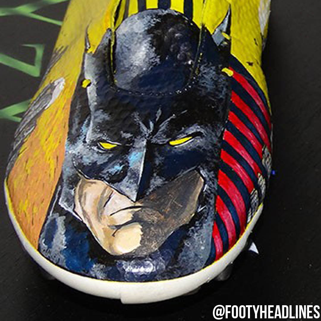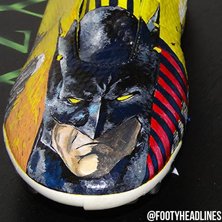 Es ist so gut wie unmöglich, alle Details der Schuhe zu nennen, die entworfen wurden, um auf dem Platz ein gewagtes Statement abzugeben, da sie vollkommen einzigartig sind. Der rechte Schuh weist Batmans Motiv auf, das das Batman-Logo auf der Ferse integriert, während der Schuh vor allem aufgrund von Batmans Gesicht auf dem Zehenbereich herausragt. Der linke Schuh fußt auf dem gleichen Designkonzept, aber hat ein Joker-Motiv, das noch mehr Details als das von Batman enthält.
